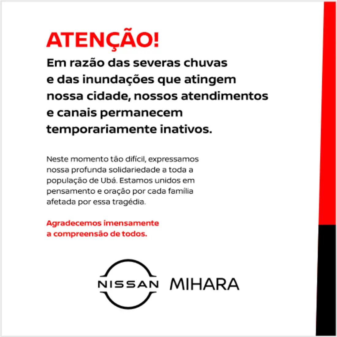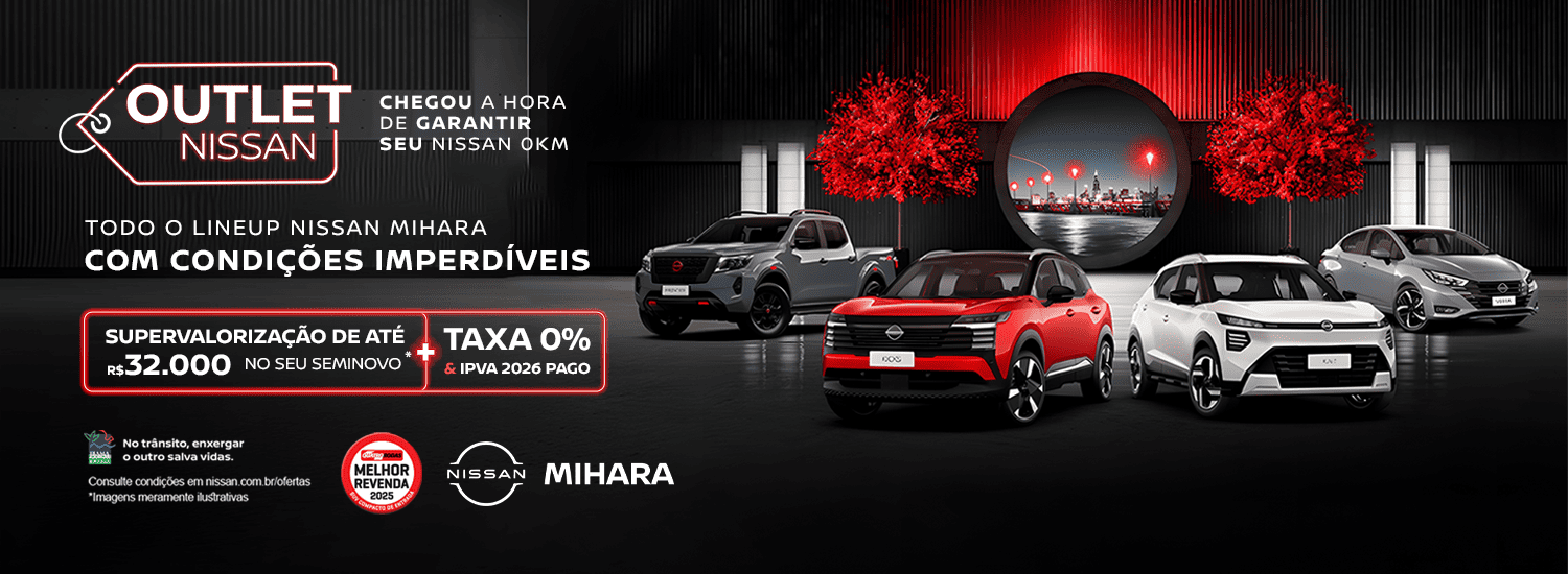 A concessionária Nissan Mihara iniciou suas atividades há 10 anos, na cidade de Ubá, Zona da Mata mineira. Fomos a primeira concessionária da marca em uma área de 3 mil metros quadrados. Marcamos forte presença na região, atuando em cerca de 52 cidades e mantemos um amplo e diversificado estoque para a comercialização de veículos novos, seminovos, peças e acessórios originais, pneus e lubrificantes. Nossa equipe de colaboradores recebe treinamento exclusivo da marca Nissan, proporcionando assim um atendimento de qualidade e utilizando equipamentos tecnológicos e inovadores. Nos preocupamos em seguir um rigoroso critério de qualidade e atendimento, que é um dos nossos pilares, promulgado pelo “Nissan Dealer Perfomance”, o sistema de avaliação mundial Nissan. Nosso objetivo é garantir a excelência em atendimento, proporcionar uma incrível experiência através dos nossos veículos e, desta forma, continuar expandindo, consolidando a marca Nissan como uma das maiores do mercado automobilístico.